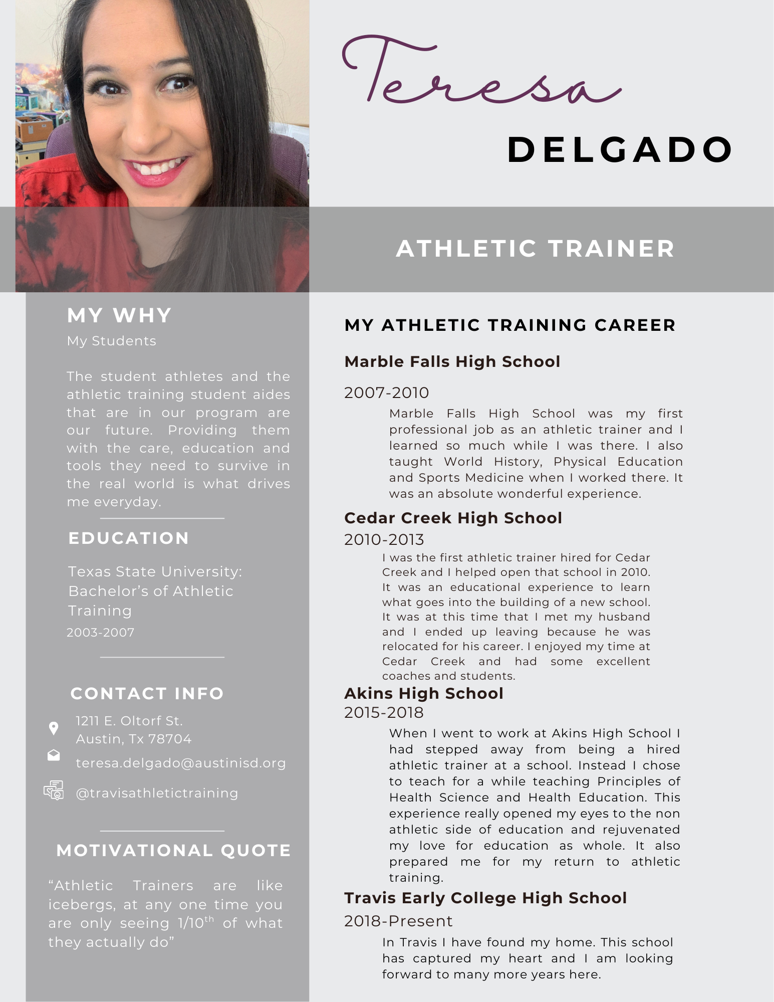 In 2018, Travis hired Teresa Delgado to take over the reins from Doc Price. Coach Delgado entered the profession of athletic training through Mike Patrick (the same one who started the department at Travis) while she was in high school at James Bowie High School. She was also taught by Doc Price in high school. Coach Delgado comes from a Travis Rebel Family, as her mom and uncle attended Travis in the 70's. In 2024, Travis hired its 3rd-ever Athletic Trainer to join Coach Delgado, giving Travis 2 Athletic Trainers hired at the same time for the first time in its history. Greg Pendergast joined the department, and with his help, the department has expanded further, providing the highest standard of care for the athletes of Travis Early College High School.